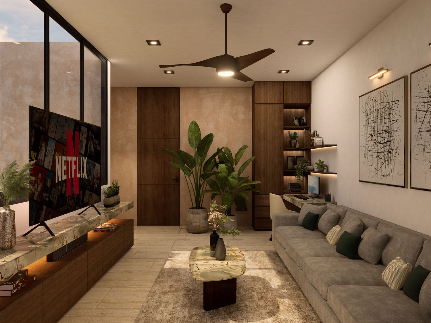 Inspirada en la arquitectura yucateca, la casa incorpora materiales de la región como el chukum, que brinda frescura a los espacios, aportando y contribuyendo al confort térmico y espacial al proyecto, a su vez, propone zonas amplias que van desde la sala hasta las recámaras, ofreciendo una experiencia habitable extensa, luminosa y sofisticada.
